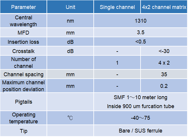 多心MTフェルールと同様な250μmピッチ間隔、SMFとの低結合損失であり、出口はシリコン光回路と同様のコア径数μm(第2コア)、20~30μmピッチ間隔を有しています